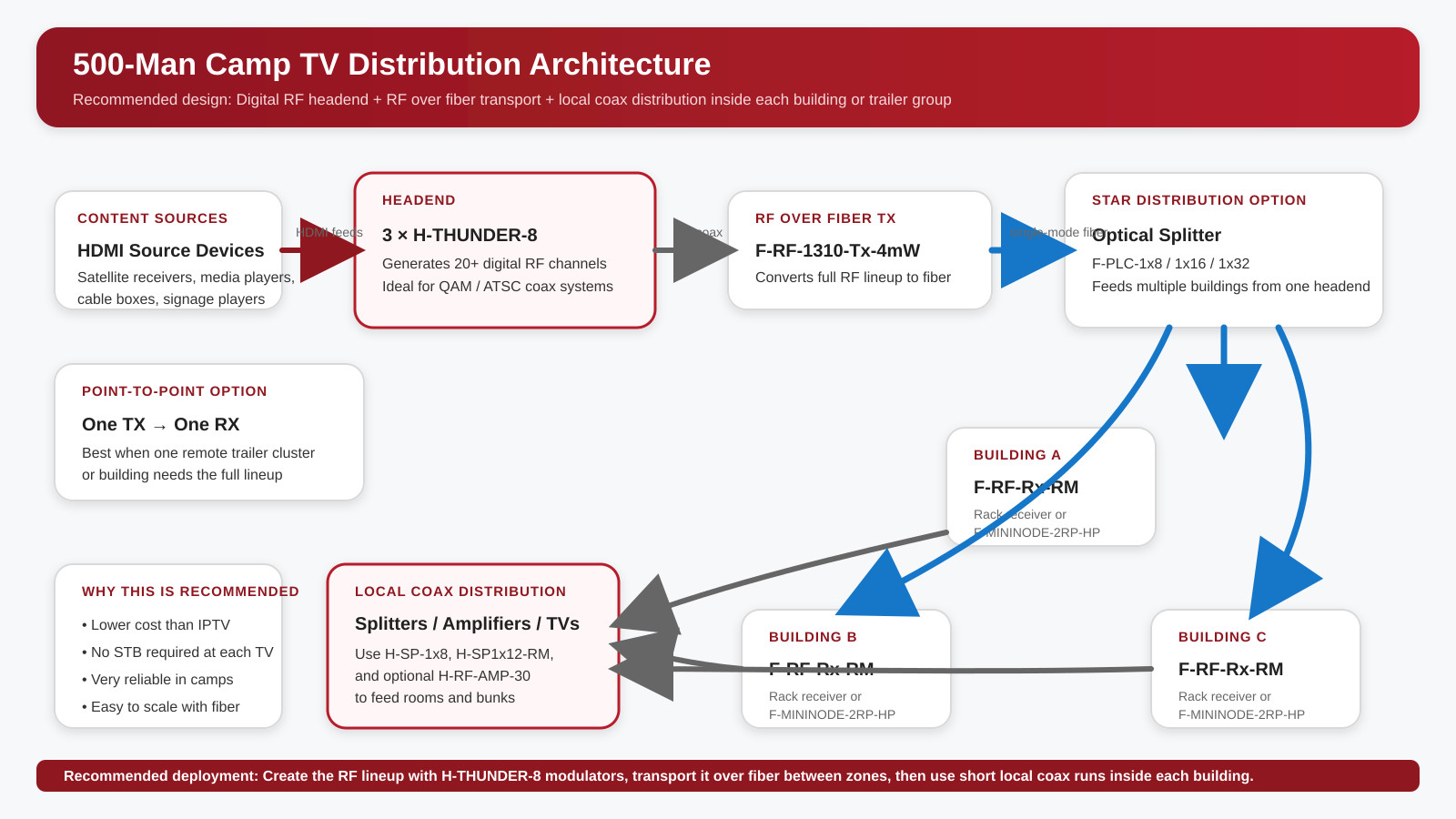Short version: If the site already has coax in the rooms or trailers, the best-value solution is usually H-THUNDER-8 -based digital RF over coax. If the camp is spread out, add RF over fiber between buildings and continue with local coax distribution at each destination.