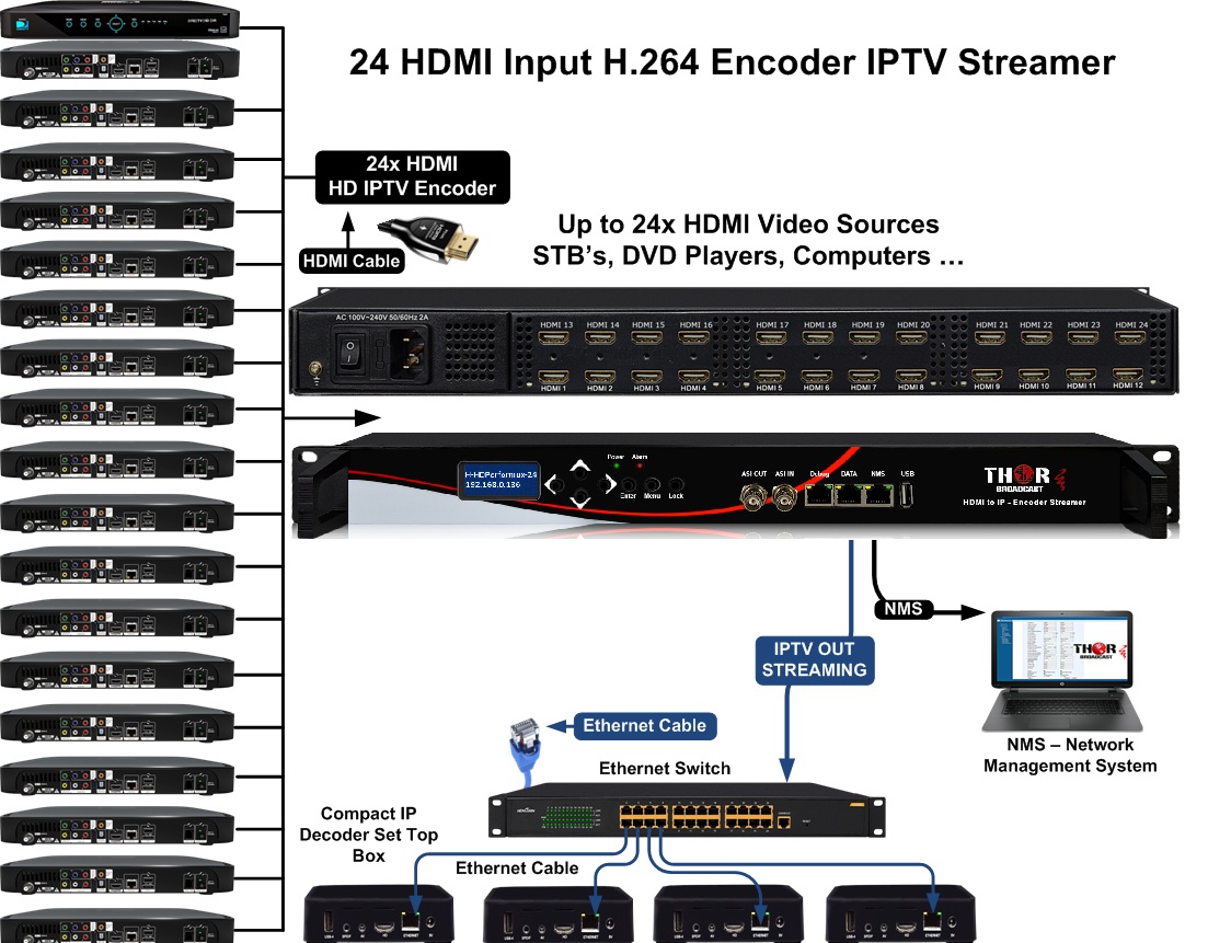 Thor Emisión de Alta Densidad Codificador H264 H-HDPerformux-XX, específicamente dise?ada para manejar hasta 24 entradas HDMI y la salida a través de 1MPTS o 24SPTS. Esta unidad dispone de un total de funcionamiento de la interfaz gráfica de usuario que Thor ha dise?ado para ayudar a navegar por la creación de todos sus Flujos H. 264 Mpeg 1 Layer 2 de Audio. Además dispone de una única salida ASI que será un reflejo de la MPTS de salida. Específicamente con el código QR, el Logotipo, y el OSD de inserción para los operadores de cable que requieren esta característica. Además, se ha PID reasignación, PCR y PSDI ajuste y la edición. Este 1ru a lo de la unidad puede sustituir a toda una cabecera con la alta densidad de 24 entrada HDMI chasis con la operación fácil y Thor Difusión líder de garantía y soporte técnico gratuito de nuestro laboratorio en Los Ángeles.