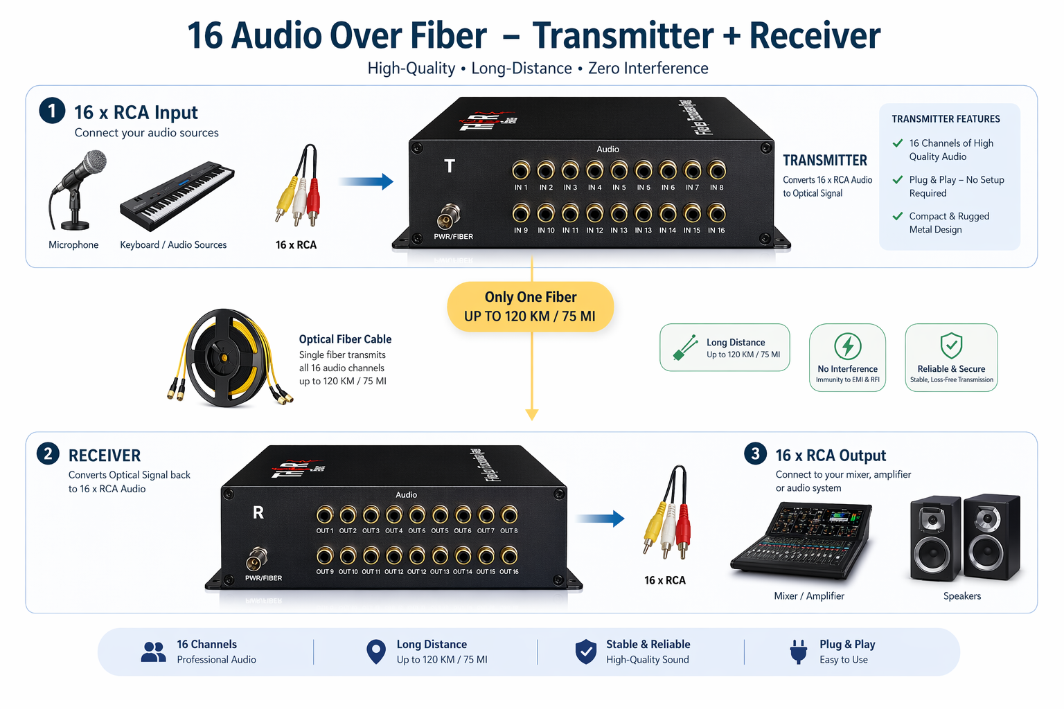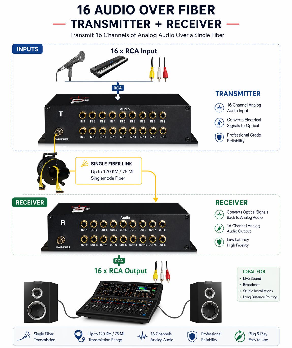 Available in multiple configurations supporting 2 to 32 channels of unbalanced RCA audio, these systems are offered in both compact standalone units and rack-mount 1RU designs, making them ideal for flexible installations. Each kit includes a matched fiber optic transmitter (TX) and receiver (RX), supporting both single-mode and multi-mode fiber.