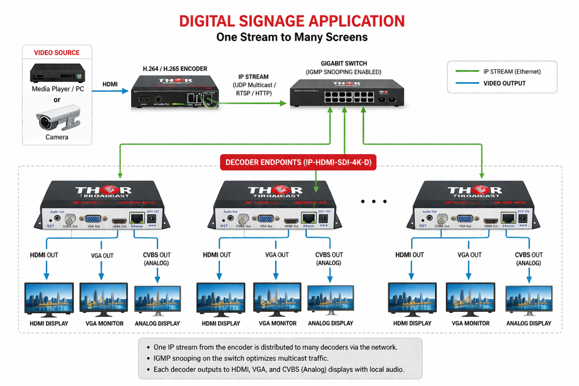 The IP-HDMI-CVBS-4K-D decoder enables scalable digital signage systems where a single video stream is distributed across multiple displays over a standard IP network. Using multicast or replicated streams, the same content can be delivered simultaneously to many endpoints with minimal bandwidth usage.