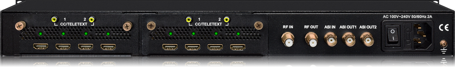 Available in 1-channel, 2-channel, and 4-channel HDMI input models. The 4k unit accepts HDMI inputs from devices such as satellite receivers, cameras, media players, Blu-ray players, and computers. The video is encoded and modulated into ATSC, DVB-C, DVB-T, or ISDB-T RF channels, allowing it to be distributed over standard coax TV networks.
