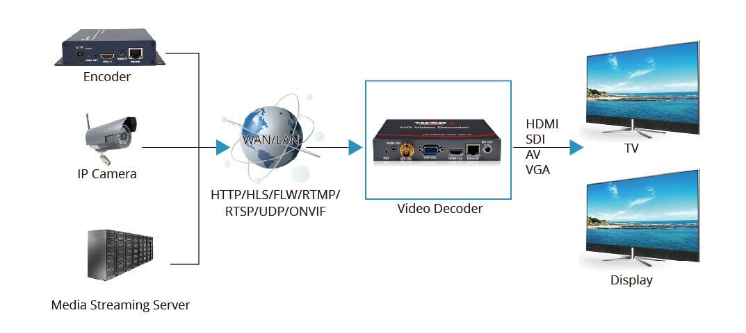 This type of device is ideal for professional environments where reliability and simplicity matter most, such as broadcasting, corporate AV, education, houses of worship, and surveillance systems. It is managed through a simple web browser interface, allowing technicians to configure streams, network settings, and outputs without installing special software. By eliminating the need for a computer at each display, the decoder reduces system complexity, lowers maintenance costs, and provides a clean, dependable way to bring network video onto standard displays and professional video systems.